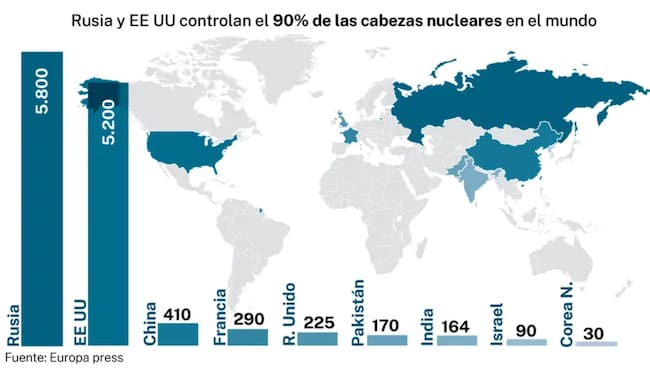 El equilibrio nuclear global está claramente concentrado en dos potencias. Rusia encabeza la lista con alrededor de 5,400 ojivas, seguida por Estados Unidos con poco más de 5,000.