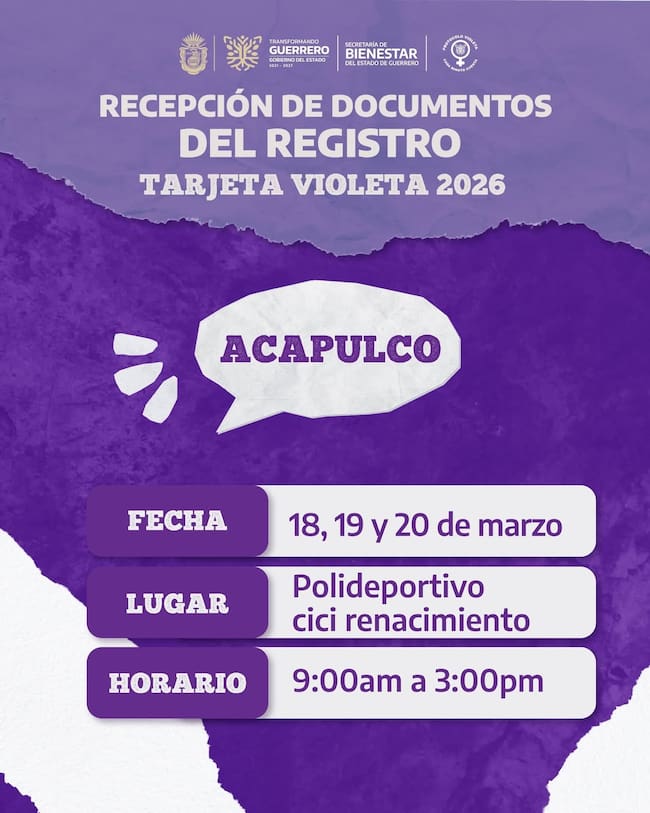 La convocatoria para el Tarjeta Violeta Guerrero registro 2026 arranca formalmente este miércoles 18 de marzo de 2026. Toma en cuenta que para esta etapa en Acapulco, los módulos de atención estarán recibiendo documentos únicamente durante tres días: 18, 19 y 20 de marzo.