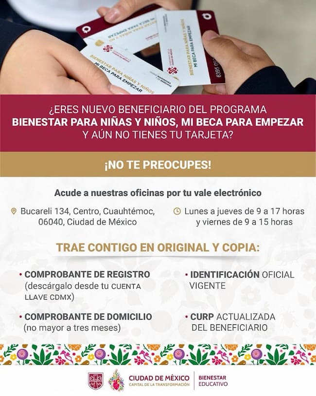 Presenta tu comprobante, INE, CURP y comprobante de domicilio para que los nuevos beneficiarios pueden tener su tarjeta con estos requisitos y aseguren el depósito de Mi Beca Para Empezar CDMX 2026.