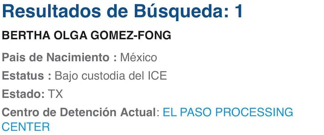 A diferencia de los procesos que enfrenta su esposo, la captura de Gómez Fong obedeció estrictamente a que no portaba documentos que acreditaran su estancia legal en los Estados Unidos, de acuerdo con la base de datos del Departamento de Seguridad Nacional (DHS).