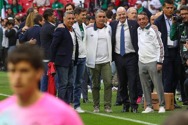 El exfutbolista, Manuel Negrete; Gianni Infantino, presidente de la FIFA; y los directivos de Televisa Univisión; Alfonso de Angoitia, Bernardo Gómez y Emilio Azcárraga Jean convivieron previo al juego México vs Portugal en el Estadio.