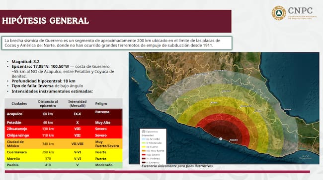 La hipótesis del primer simulacro nacional 2026 plantea un sismo de magnitud 8.2 con epicentro en la costa de Guerrero, específicamente a 55 km al Noroeste de Acapulco, entre Petatlán y Coyuca de Benítez, con una profundidad de 18 km.