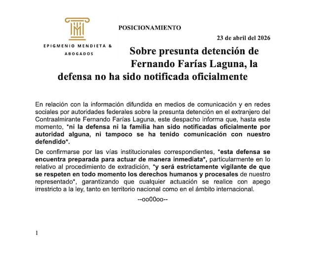 Por su parte, la firma Epigmenio Mendieta y Abogados, informa que ni la defensa ni la familia de Fernando Farías Laguna han sido notificados oficialmente de su detención por parte de ninguna autoridad, además de que no se han comunicado con su defendido.