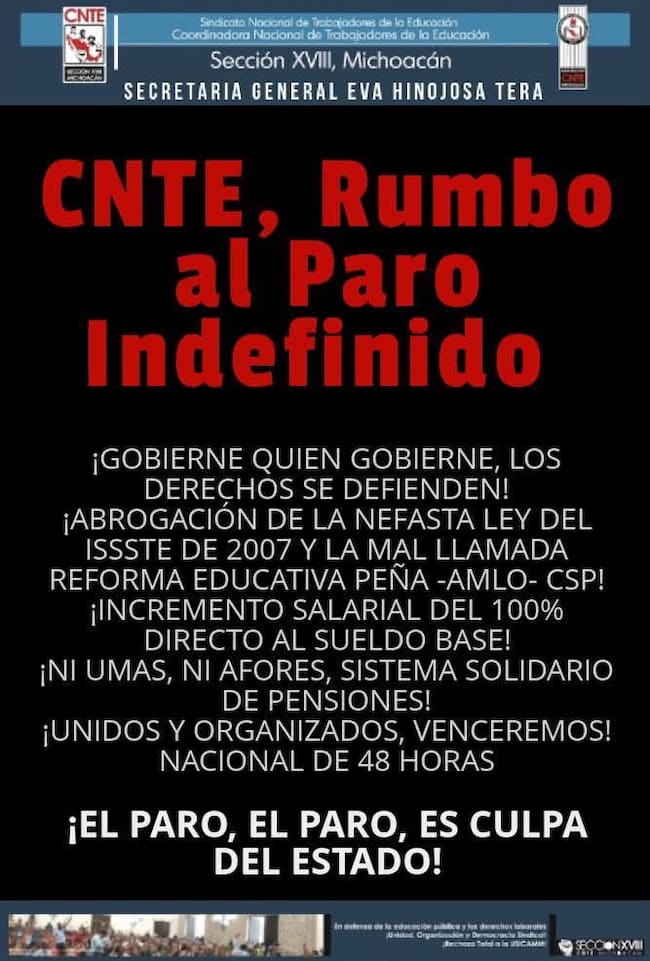 No rodará el balón si no hay solución amagó la Coordinadora Nacional de Trabajadores de la Educación (CNTE) al anunciar el inicio de un paro nacional indefinido y una huelga general programados para el próximo mes de junio, es decir junto a la realización del Mundial, ello para presionar al Gobierno Federal a que cumpla diversas demandas laborales y salariales.