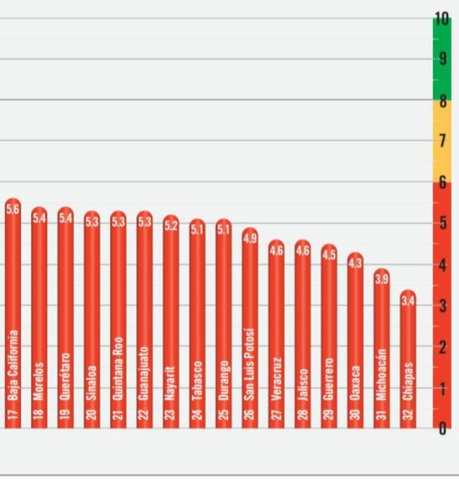 En los seis rubros, Jalisco sacó calificaciones reprobatorias, en el de Aprendizaje obtuvo su mejor puntuación con 5.9, con lo que le alcanzó para estar entre los primeros cuatro estados.