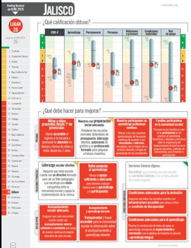 La Asociación Civil Mexicanos Primero presentó el "Índice de Cumplimiento de la Responsabilidad Educativa Estatal 2018", en el que muestra a Jalisco entre las cinco peores entidades, en su evaluación a través de 13 indicadores de seis rubros.