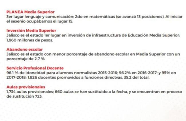 La Secretaría de Educación Jalisco, destacó logros de la presente administración, que señala la evaluación de Mexicanos Primero, como ser la única entidad que ha consolidado una estrategia estatal de Aulas Interactivas para secundarias con más de 7 mil 500. Además de que es el estado número uno en inversión de infraestructura de Educación Media Superior con mil 960 millones de pesos. Y es la entidad con menor porcentaje de abandono escolar en Media Superior con 2.7 %.