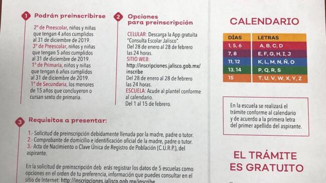 La Secretaría de Educación Jalisco dio a conocer el calendario de las preinscripciones del ciclo escolar 2019-2020 de educación básica: preescolar, primaria y secundaria, que será a partir del 1 febrero, con base a la primera letra del apellido del aspirante.