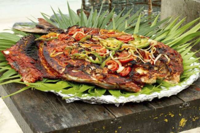 Pescado blanco envuelto en hojas de plátano y algunas cascaras de coco. En base de achiote como condimento.
