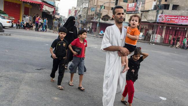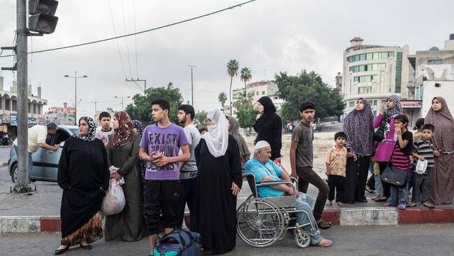 Foto 3 de 5Sin lugar a dónde ir, decenas de residentes de Shujaiyeh buscaron transporte después del bombardeo.