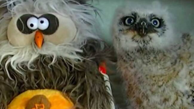 Se trata de un pequeño búho que le copia a un peluche; sí a un búho de peluche que se mueve al ritmo de la música.