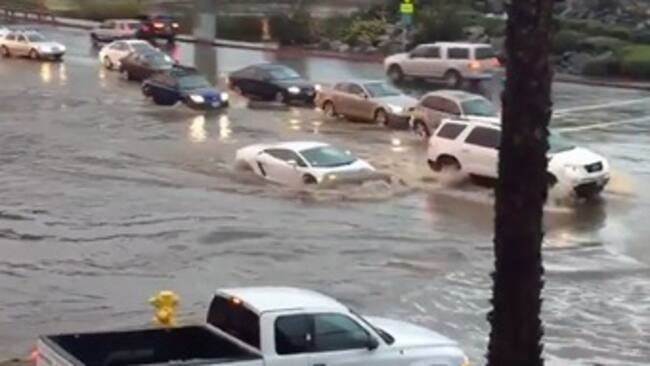 Un Lamborghini en la ciudad de San Diego cruzó por en medio de una intersección inundada, mientras todos los demás autos lo hacían con cautela, el conductor decidió que sería buena idea convertir su auto en submarino