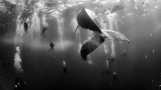 Foto 19 de 22Naturaleza: Anuar Patjane Floriuk, segundo premioMmurmuradores de ballenas: buceadores observan y rodean una ballena jorobada y su cría recién nacida mientras nadan alrededor de Roca Partida en las Islas Revillagigedo , México.