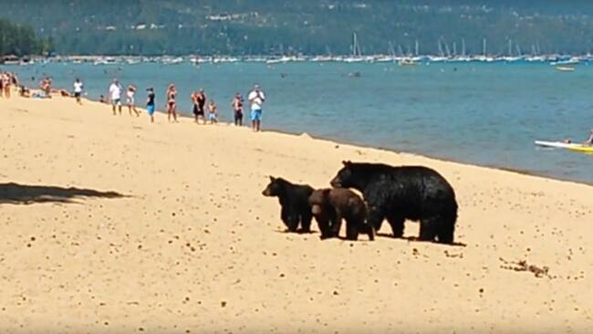 Unos inusuales visitantes se unieron a varios vacacionistas que se refrescaban en Lake Tahoe: una osa y sus dos oseznos