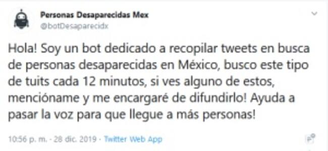 En twitter lo puedes encontrar como @botDesaparecidx, la función de esta cuenta es que el bot se encarga de recaudar información de casos en todo el país y contribuye, a partir de retuits, a multiplicar la difusión de casos que no han tenido cobertura mediática, Este mes cumple un año de actividad en la Red y acumula más de 4 mil seguidores.
