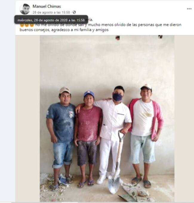 Manuel Chimas, es un joven originario de Yucatán y compartió una fotografía en su perfil de Facebook donde en compañía con sus compañeros de trabajo en la albañilería y él portando su uniforme de enfermero escribe un mensaje que ha conmovido a muchos: