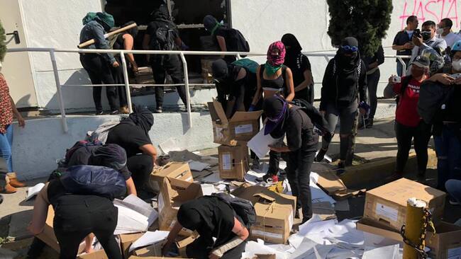 Este grupo de mujeres rompieron una puerta de cristal del Cavi, donde sacaron cajas con cientos de Carpetas de Investigación y tras romper algunos documentos y tirarlos en la calle, quemaron las cajas que eran utilizadas para resguardar los documentos oficiales.