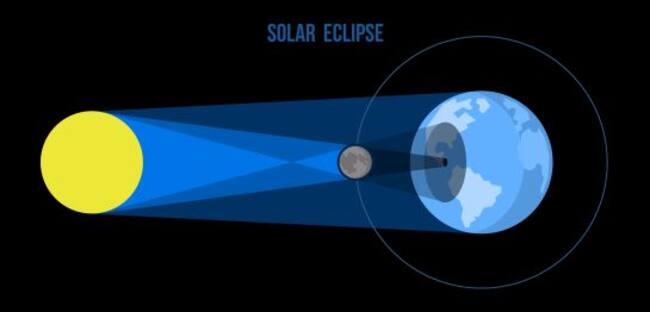 Un eclipse solar ocurre cuando la Luna se interpone entre la luz del Sol y proyecta su sombra sobre la Tierra. Esto quiere decir que, durante el día y con luz solar, oscurece y pareciera que es de noche.