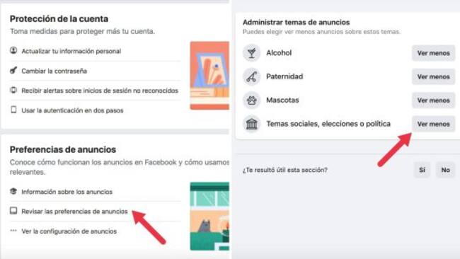 Selecciona “Revisar las preferencias de anuncios”; da click en “Ver menos” dentro de la categoría que dice “Temas sociales, elecciones o política”. / Captura de pantalla