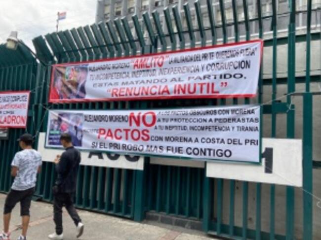 Durante un acto de protesta frente a la sede partidista, un grupo de priístas inconforme pegaron un moño negro en señal de luto y mantas en las que se leía “ AMLITO renuncia, inútil” entre otros mensajes como “Mereces cárcel por ladrón”