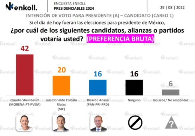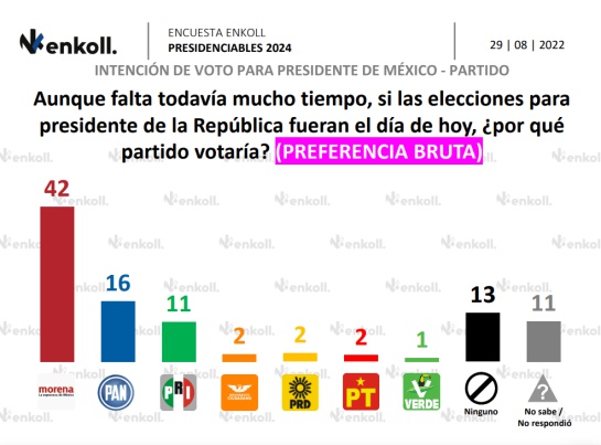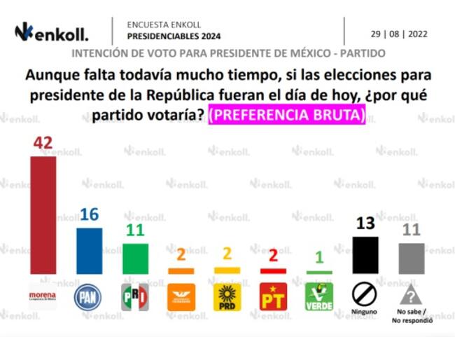Morena mantiene una sólida posición como partido mayoritario con el 42 por ciento de la preferencia bruta, seguido del PAN con 16 por ciento y el PRI con un 11 por ciento. Movimiento Ciudadano, PRD y PT mantienen el 2 por ciento respectivamente, mientras que el PVEM solo alcanza el 1 por ciento.