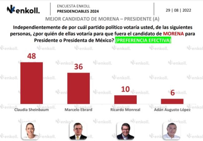 Marcelo Ebrard, quien ocupa el segundo lugar en las preferencias al interior de Morena, también se perfila como un contendiente que podría triunfar en los comicios a celebrarse en junio de 2024, aunque con una intención de voto bruta del 36 por ciento, es decir, 6 puntos menos que Sheinbaum.