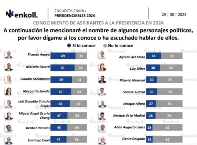 Llama la atención que el más conocido de los aspirantes presidenciales sea Ricardo Anaya con el 69 por ciento, el excandidato panista supera a Marcelo Ebrard (66 por ciento) y Claudia Sheinbaum (59 por ciento), no obstante, quien genera una mejor opinión es el alcalde de Monterrey, Luis Donaldo Colosio, seguido de Sheinbaum y Ebrard.