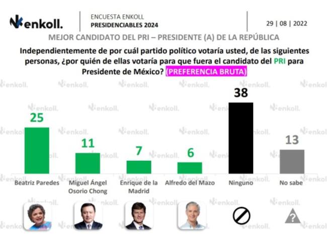 Del PRI menciona a Beatriz Paredes Rangel con 25% de preferencia dejando a Miguel Ángel Osorio Chong y a Enrique de la Madrid con 11 y 7 puntos porcentuales respectivamente.