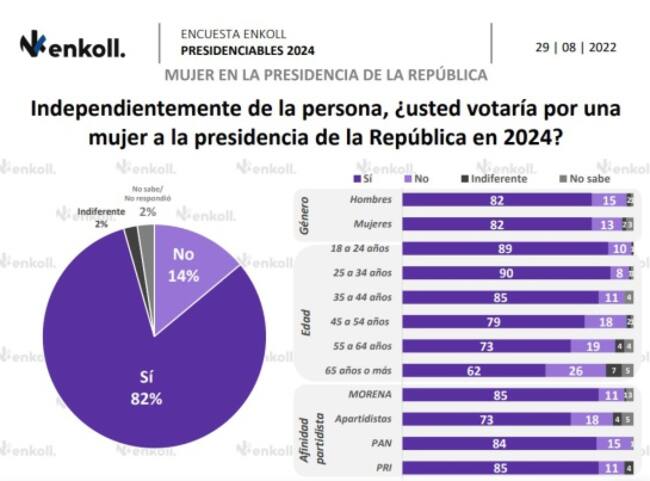 Le encuesta de Enkoll revela que el 82% de los mexicanos están dispuestos a votar a favor de que una mujer ocupe la presidencia de la República en 2024.