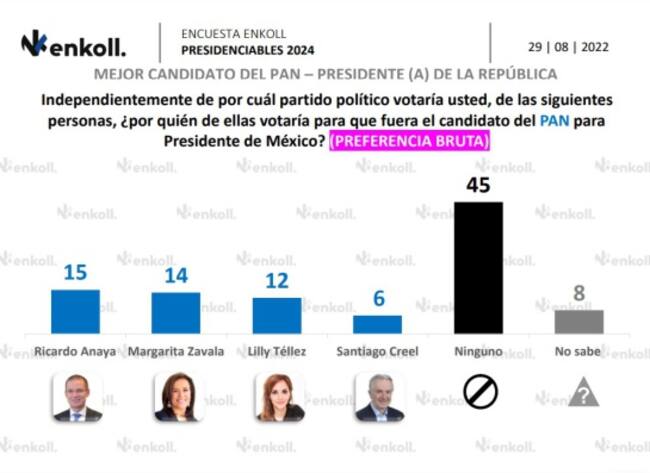 El estudio de opinión señala que por el PAN Ricardo Anaya aventaja a Margarita Zavala y Lilly Téllez con porcentajes de preferencia de 15, 14 y 12% respectivamente.