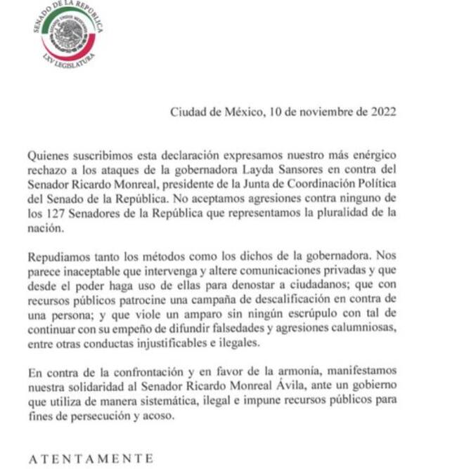En un desplegado firmado por 38 senadores de Morena, 13 del PAN, 12 del PRI, 12 de Movimiento Ciudadano, 5 del Partido Verde, 3 del PRD y 4 del Grupo Plural, expresaron su “más enérgico” de Sansores Sanromán en contra de Monreal Ávila.