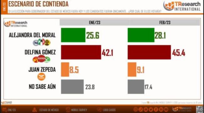 El estudio indica que en febrero, la morenista tiene el 45.4 por ciento de intención de voto, por 28.1 por ciento de Alejandra del Moral, una diferencia de 17.3 puntos, demostrando que la aspirante del PRIAN no levanta en las encuestas.