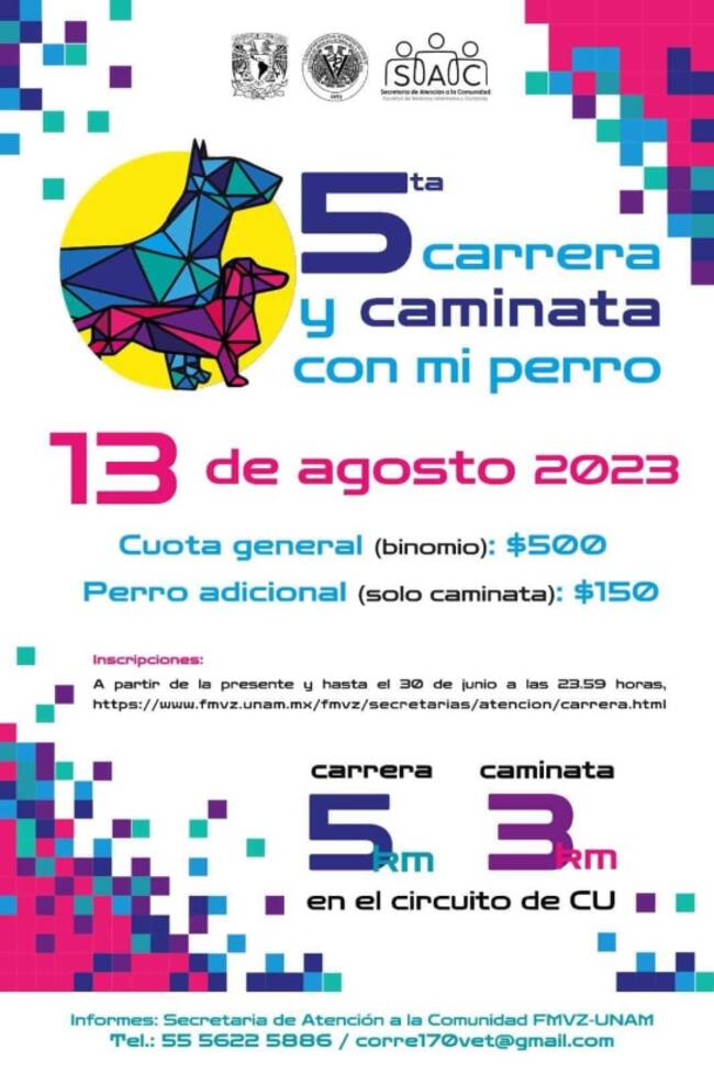 La quinta edición de Carrera y Caminata con mi Perro de la UNAM será una actividad donde tú y tu compañero de cuatro patitas podrán recorrer 3 kilómetros caminando o 5 kilómetros ya sea corriendo o trotando.