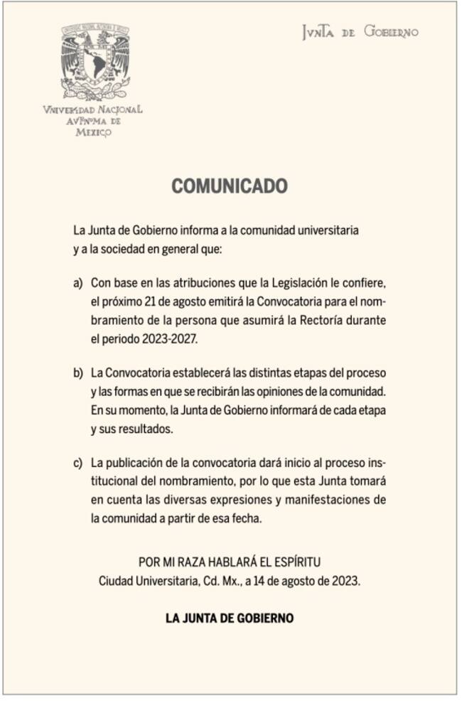 El 21 de agosto iniciará la convocatoria para elegir nuevo rector de la UNAM; Hay 3 posibles candidatos