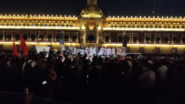 19:11 horas Familiares de los 43 llegan al Zócalo y frente a Palacio Nacional inicia el mitin a nueve años de la desaparición de los 43 normalistas de Ayotzinapa.